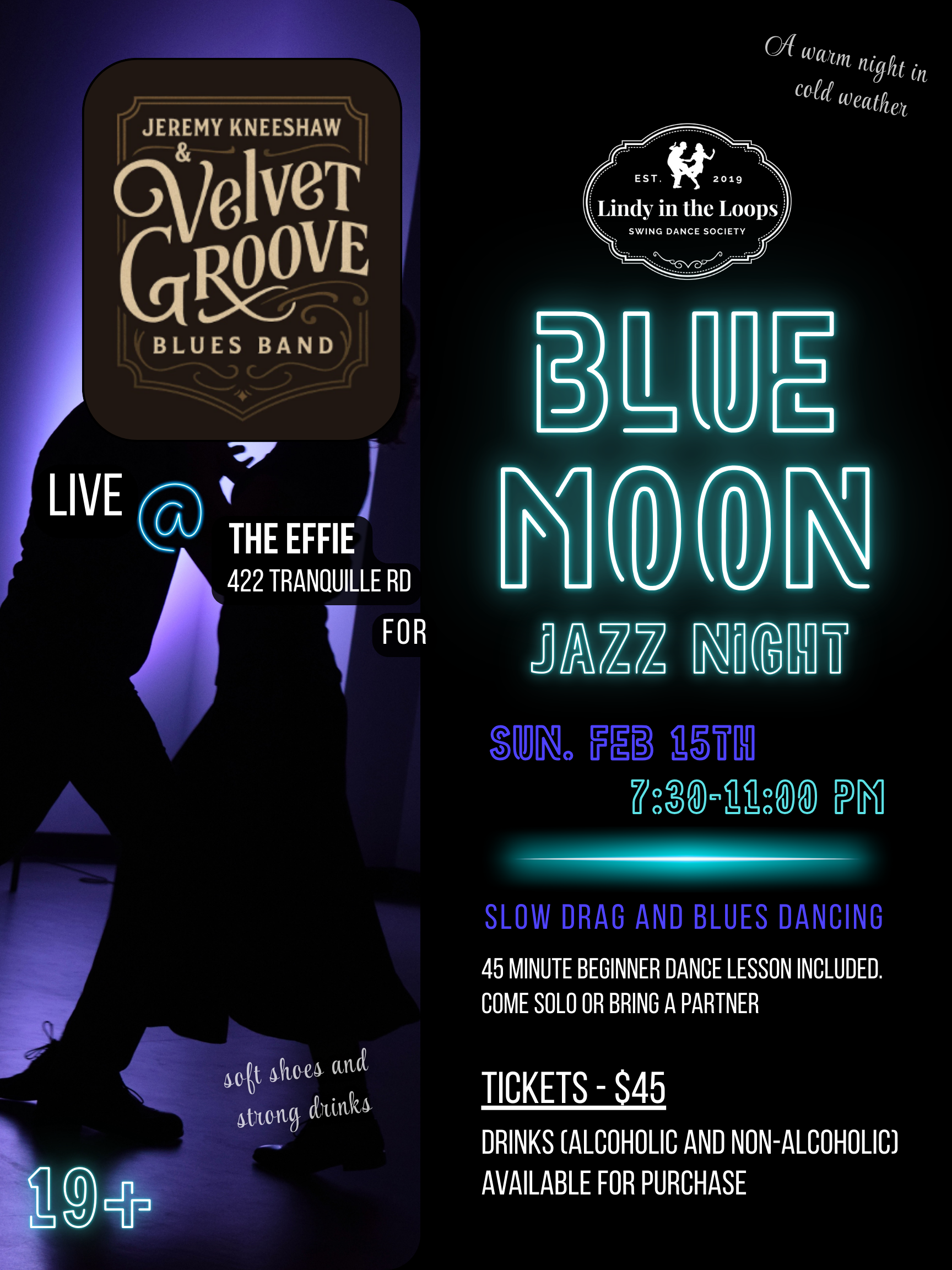 Join us in Kamloops for a speakeasy-inspired evening of live music, smooth jazz and blues dancing. The night begins with a short slow drag lesson, followed by relaxed social dancing to live music in a laid-back, intimate setting. Drinks (alcoholic and non-alcoholic) will be available for purchase. 19+ event.